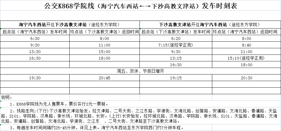 转海宁市大元公交有限责任公司,自2023年2月20日起K868学院线(海宁汽车西站←→浙江财经大学)调整为(海宁汽车西站←→下沙高教文津站),现将发车时间表公布:
