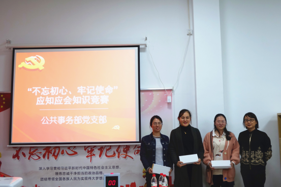 本次“不忘初心、牢记使命”知识竞赛分综合代表队,饮服代表队,物业、经发代表队,资产、公寓代表队四支代表队,内容包括十九大会议期间习近平总书记所作的报告、《党章》、《习近平新时代中国特色社会主义思想学习纲要》、《习近平关于“不忘初心、牢记使命”论述摘编》等内容,竞赛分为必答题、抢答题、观众题、风险题4个环节,以累计分数的形式计算得分,得分最高者获胜,最终资产、公寓代表队获胜。