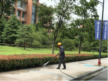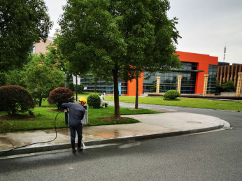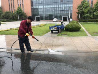 冲洗地面、雨棚作为每年的常规工作之一,物业服务中心每年都坚持做好此项工作。由于地面边角的泥垢容易堆积且较难清洗,往年保洁人员都是用地刷对地面进行刷洗,范围大任务重且耗时耗力,今年我们新引进了高压冲地机,利用高压对地面、台阶、人行道以及雨棚的每个角落以及一些刷子清洗不到的缝隙都进行了细致到位的清洗。