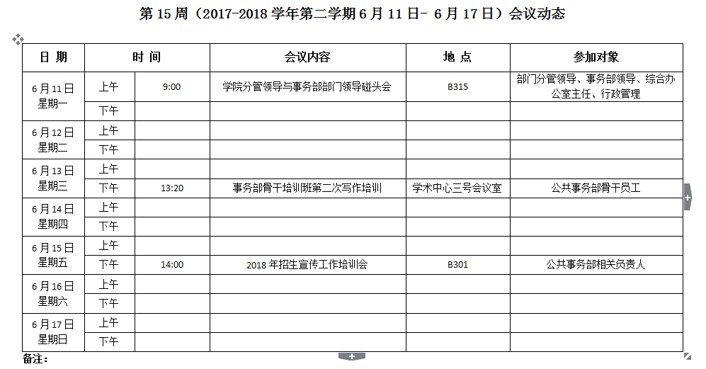 第15周(2017-2018学年第二学期6月11日- 6月17日)会议动态