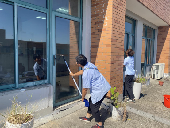在确保安全的情况下,保洁人员认真擦拭了各二级学院办公区域的窗户玻璃,整个环境窗明几净,焕然一新。