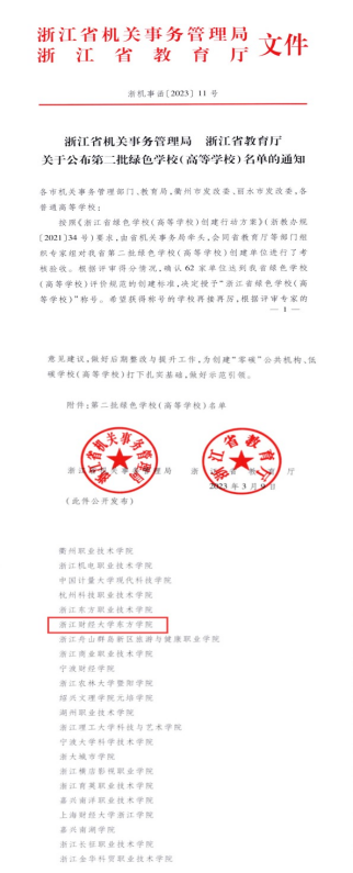 日前,浙江省机关事务管理局、浙江省教育厅公布第二批绿色学校(高等学校)名单,我院获评“浙江省绿色学校(高等学校)”称号。