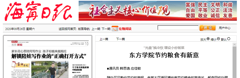 随处可见勤俭节约的海报,食堂大厅循环播放着节约粮食的宣传片,餐盘回收处醒目的标语——“今天你光盘了吗?”一个个光溜溜的盘子……近日,走进浙江财经大学东方学院食堂,就可以感受到文明用餐的良好风气。9月开学后,东方学院推出了“锦囊三宝”助力“光盘”,不...