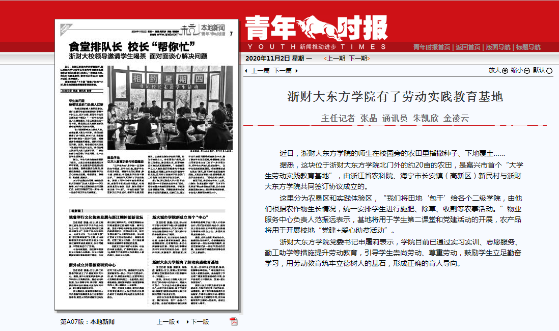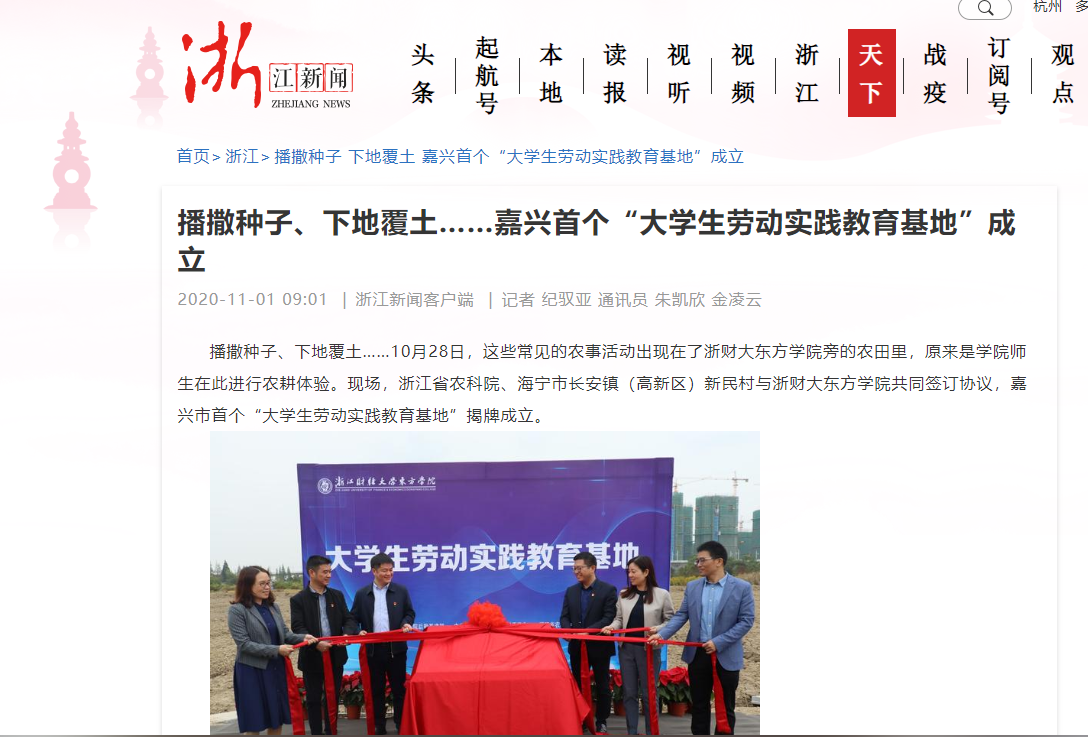 主任记者 张晶 通讯员 朱凯欣 金凌云近日,浙财大东方学院的师生在校园旁的农田里播撒种子、下地覆土……据悉,这块位于浙财大东方学院北门外的约20亩的农田,是嘉兴市首个“大学生劳动实践教育基地”,由浙江省农科院、海宁市长安镇(高新区)新民村与浙财大东方学...
