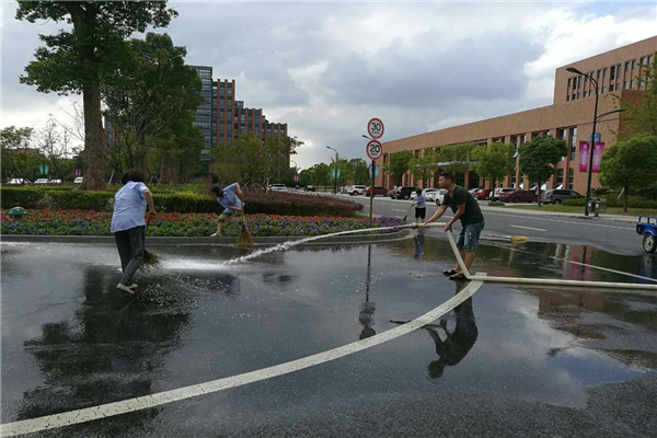为减少道路积尘,清扫道路淤泥,打造干净、整洁的校园环境,物业服务中心组织员工不定期进行冲洗校园主干道活动,集中冲洗行政楼、图书馆以及教学楼周边的主干道。